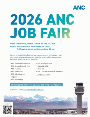ANC will be holding its 2026 ANC Job Fair on Wednesday, March 25, from 11:00 a.m. to 3:00 p.m. in the North Terminal. Join us to learn about careers at the airport, network, and share experiences. Meet employers and apply for exciting job opportunities. Kiosks will be available at the job fair so you can apply on-site. Representatives from major airport departments, as well as key tenants hiring ahead of the summer season, will be in attendance.