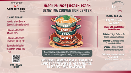 With much anticipation and excitement, we announce the date of The George Hieronymous Empty Bowl Project for Saturday, March 28th, 2026! The event will begin at 11:30 am and go until 1:30 pm. To be held at the Dena’ina Center in downtown Anchorage, the day will include unlimited soup and cornbread, the opportunity to take home a handcrafted bowl, a silent auction, live entertainment, kids’ activities, and so much more! This much-loved community event was first held in 1994, and Bean’s Cafe is proud to continue the tradition. We are honored to have the Anchorage Clay Arts Guild, the organization that brought this event to Anchorage, in attendance once again this year. During this special gathering, we raise awareness and funds to combat hunger and remind everyone of the empty bowls in our community and the needs of our most vulnerable neighbors: those experiencing hunger, food insecurity, and homelessness. The event symbolizes the importance of what one bowl of soup can mean to someone concerned that they will not have enough to eat that day.