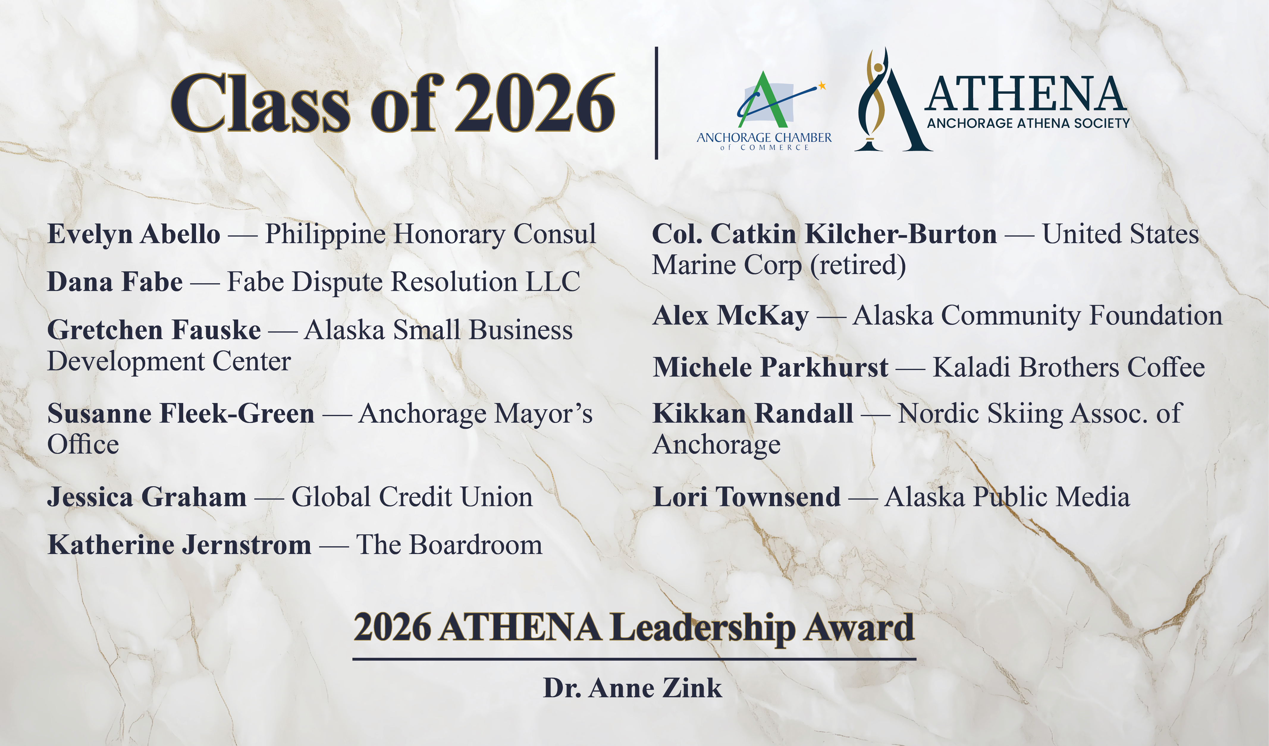 FOR IMMEDIATE RELEASE                    February 18, 2026                                                                                          The Anchorage ATHENA Society is pleased to announce the inductees into the Class of 2026. A group of 11 women and this year’s Leadership Award recipient will be honored at the annual Anchorage ATHENA Society luncheon Monday, March 16, 2026, at the ...read more